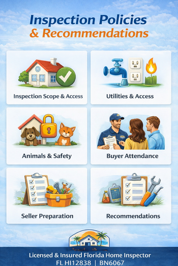 A home inspection is based on observations made on the date of the inspection and represents a snapshot in time; it is not a prediction of future conditions. A general home inspection identifies only material defects that are visible and accessible at the time of inspection. Beach House Home Inspections LLC provides clear inspection policies and practical recommendations to help buyers, sellers, and homeowners understand the inspection process and property conditions while supporting a safe and efficient inspection experience.